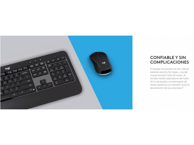 El teclado funcionará con las mismas baterías durante 36 meses, y las del mouse durarán hasta 18 meses. El teclado resiste salpicaduras de hasta 60 ml de líquido y el estampado de teclas resistente a la abrasión evita la decoloración de los caracteres.