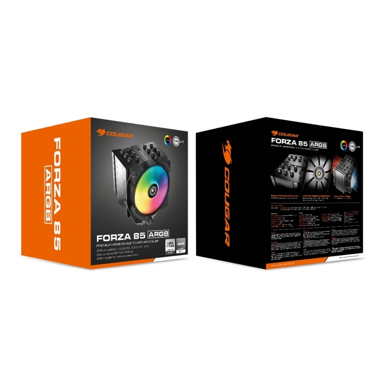 El Forza 85 ARGB es un enfriador de aire de una sola torre para CPU de gama media a alta: junto con el ventilador de alto rendimiento MHP120 ARGB de COUGAR y con una cubierta superior de diseño único, logra un equilibrio ideal entre un funcionamiento ultrasilencioso y una refrigeración eficaz. Forza 85 ARGB es ideal para usuarios con alto rendimiento y necesidades de overclocking ligero.